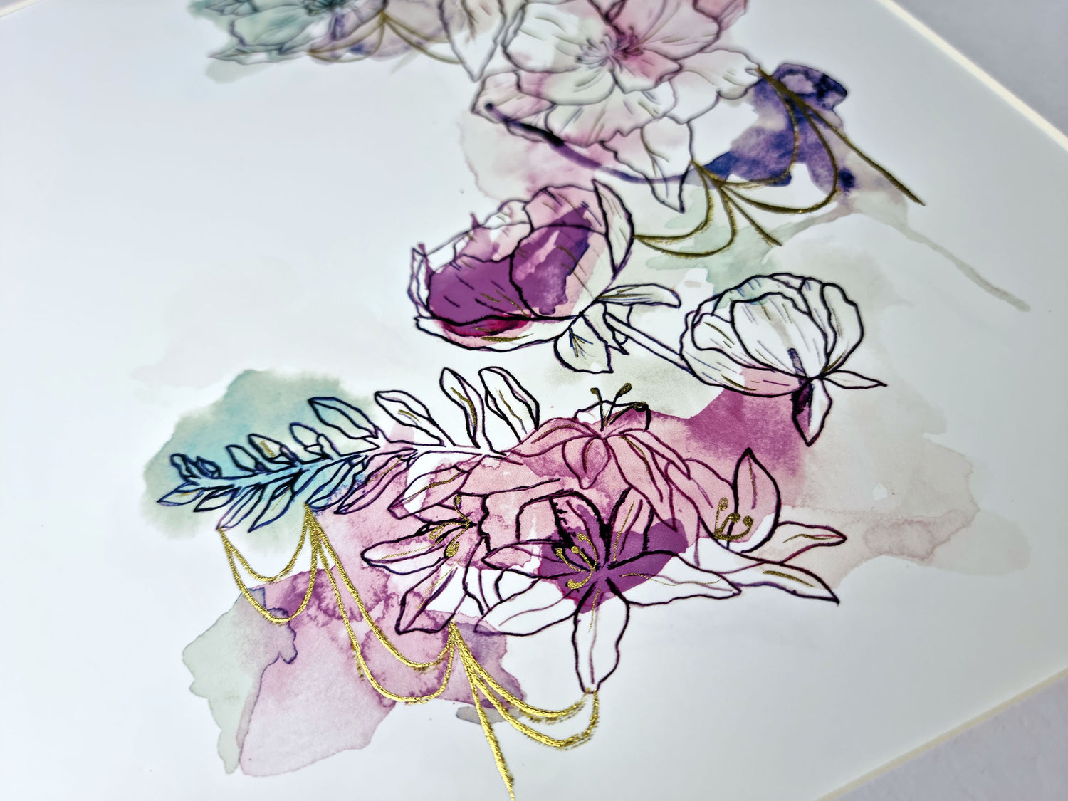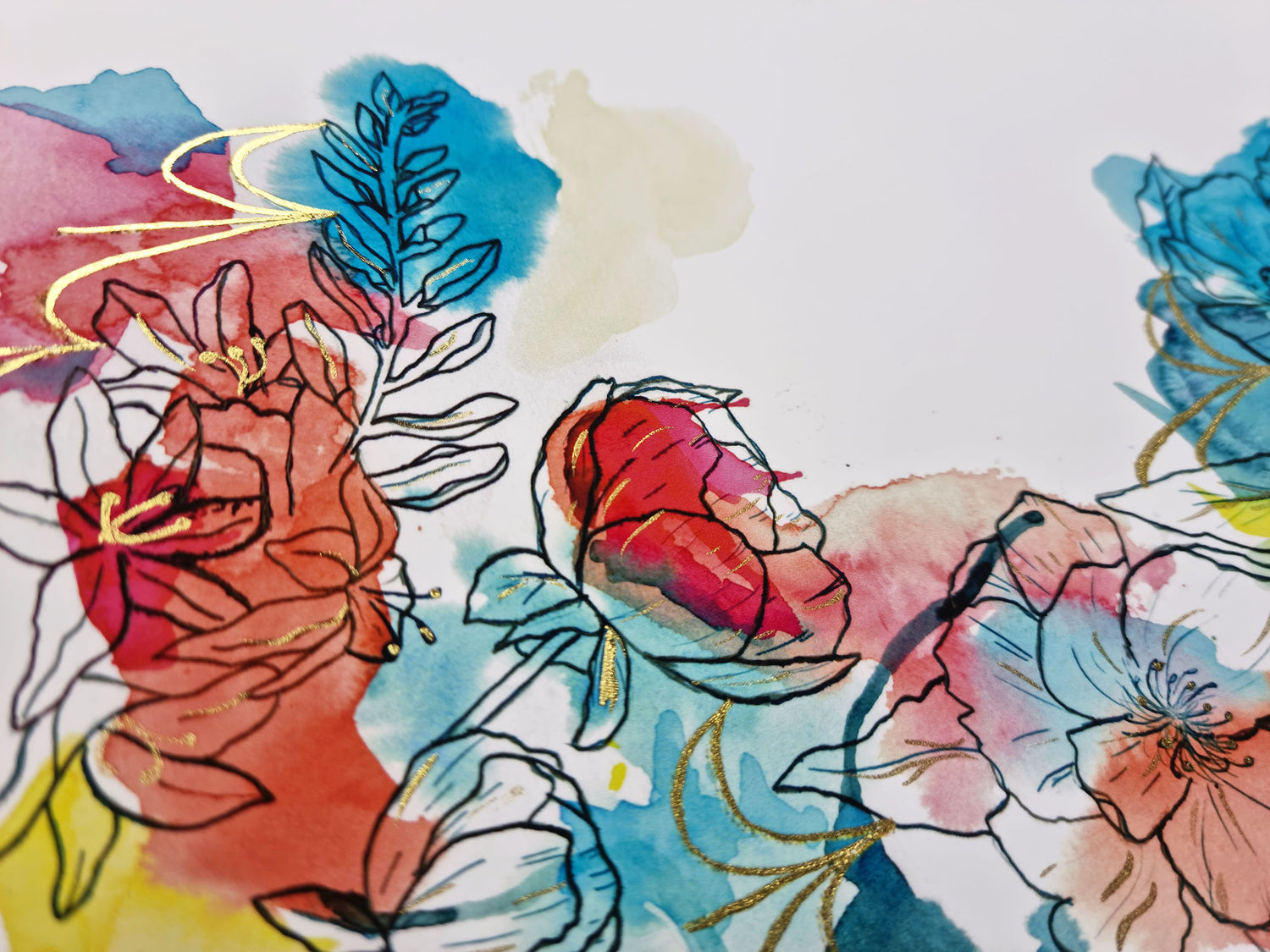 Floral line art in ink and watercolour. Hand finished with gold accents for sophisticated art in various colourways
