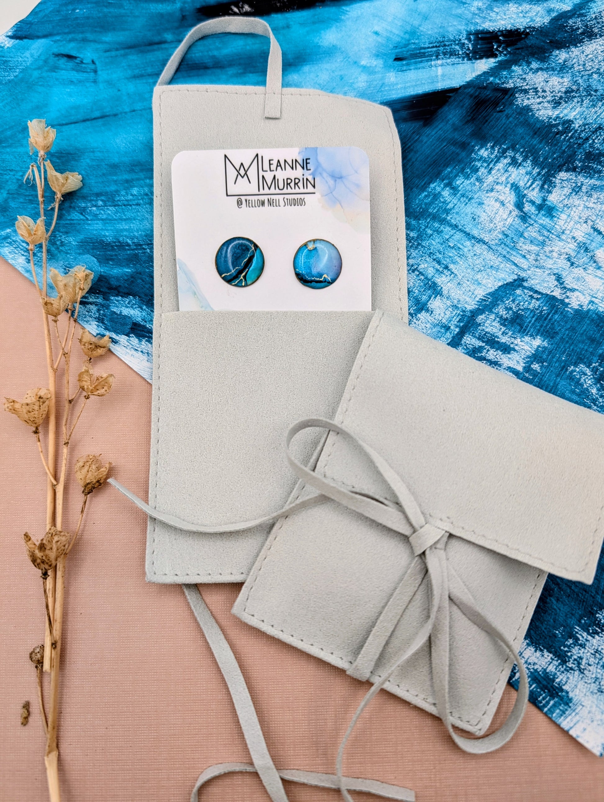 Handmade original alcohol ink art earrings inspired by the hills, rivers and skies of the Yorkshire Dales. Each pair are unique and feature a complementary asymmetric design, embellished with gold details and finished with a layer of glossy protective resin.