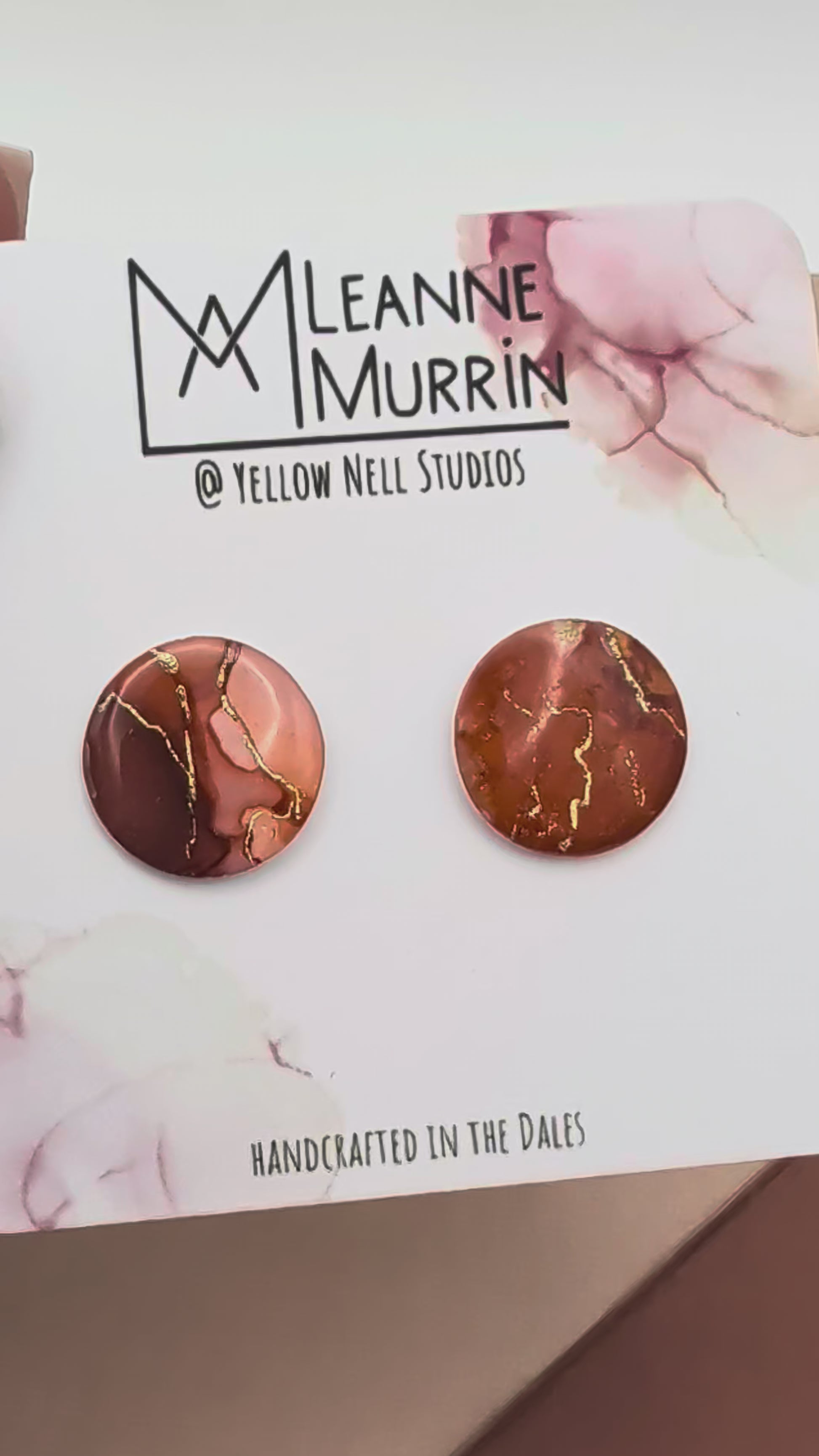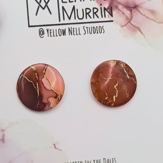 Handmade original alcohol ink art earrings inspired by the hills, rivers and skies of the Yorkshire Dales. Each pair are unique and feature a complementary asymmetric design, embellished with gold details and finished with a layer of glossy protective resin.