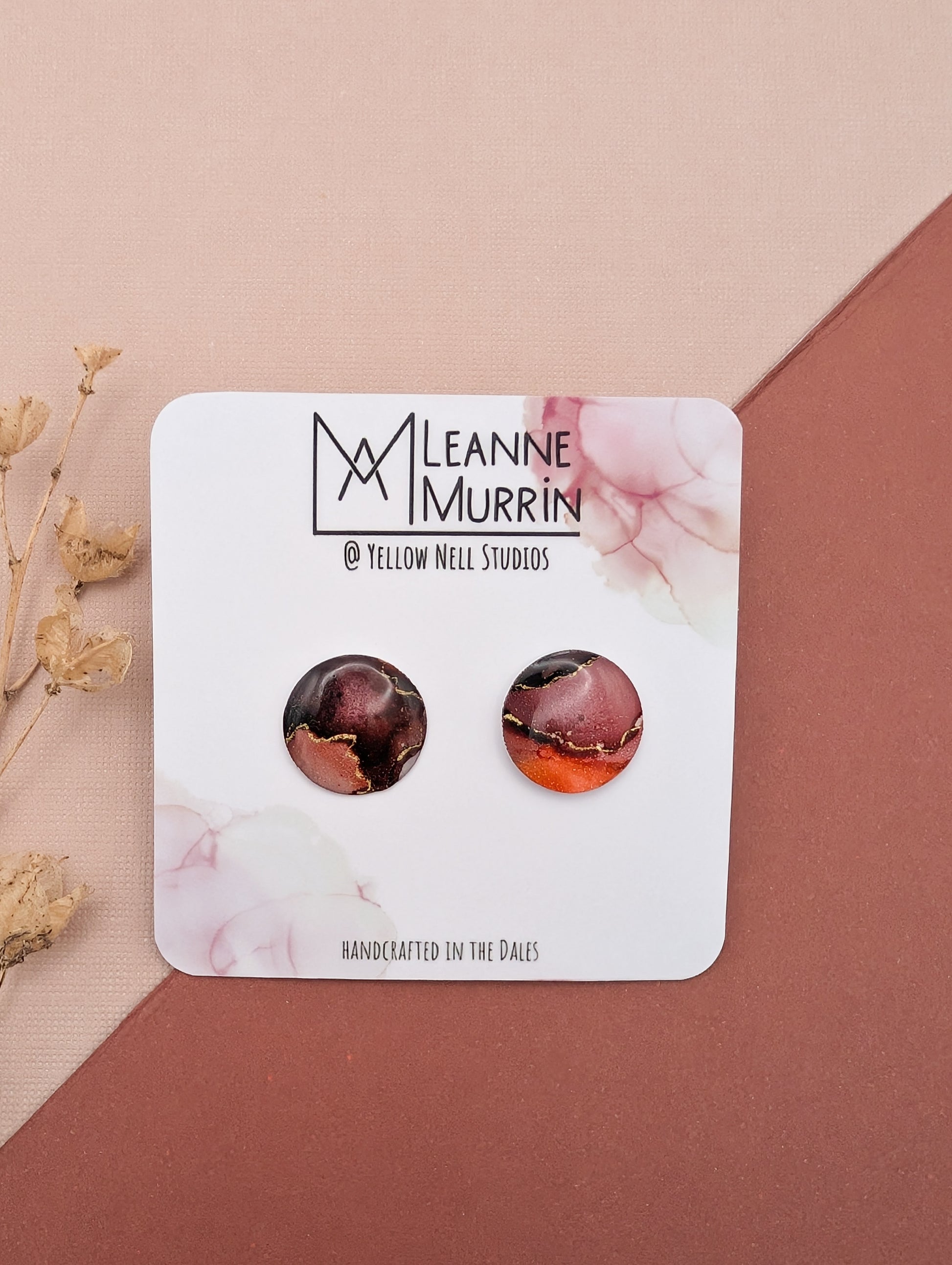 Handmade original alcohol ink art earrings inspired by the hills, rivers and skies of the Yorkshire Dales. Each pair are unique and feature a complementary asymmetric design, embellished with gold details and finished with a layer of glossy protective resin.
